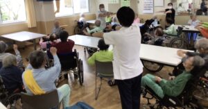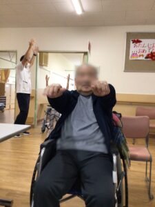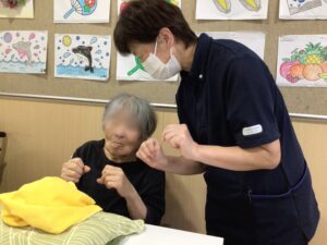 リハビリスタッフの動きを見ながら「1、2、3…」とゆっくり声を出しながら腕や足首の曲げ伸ばしなどの体操をみんなで行いました。