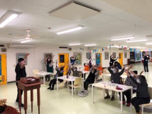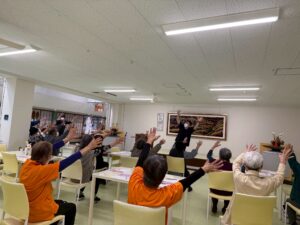 今月はフォークダンスの定番曲『マイムマイム♬』に合わせて、椅子に座ったままできる動きを行いました。