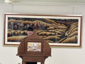 紙芝居は昔ばなしの「ねずみきょう」というお話でした。本格的な紙芝居セット、素敵な声、そして強弱のある読み方にみなさん引き込まれじっと見入っていました。