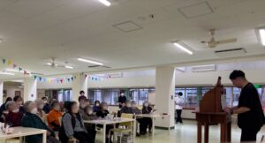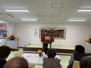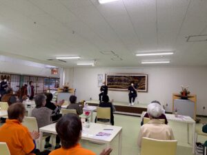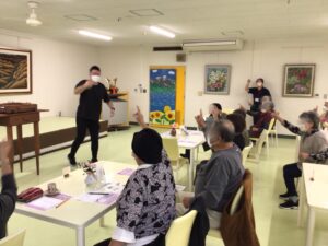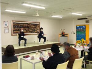 その後はグループホーム等の介護サービスを行っているふれあいグループのスタッフ様による紙芝居が行われました。最初に『北国の春』と『ズンドコ節』を歌いながら身体を動かしました。