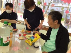 その後はカフェでお茶会。ジュースやポテトチップスなどのお菓子を頂きました。